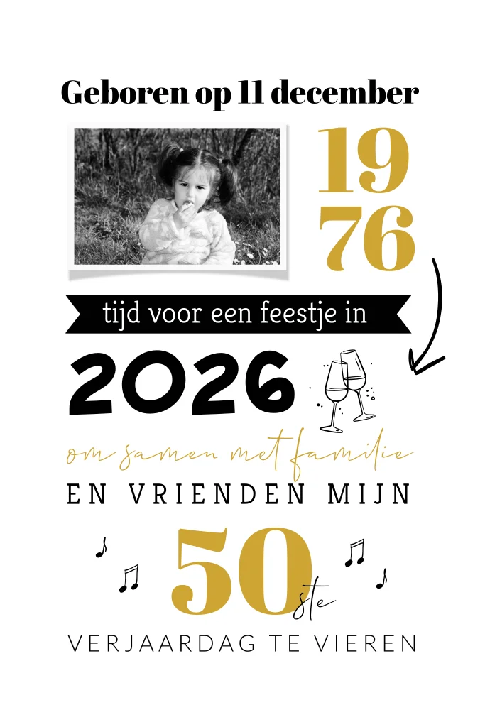 Trendy uitnodiging met eigen foto voor een 50ste verjaardag in handlettering stijl. Voor zowel een man abraham als vrouw sarah te gebruiken. Op deze verjaardagsuitnodiging staan diverse tekeningetjes (wijnfles, slingers en muzieknoten), verschillende teksten. Deze kwalitatieve maar niet dure uitnodiging is betaalbaar en extra voordelig vanwege het enkele formaat.