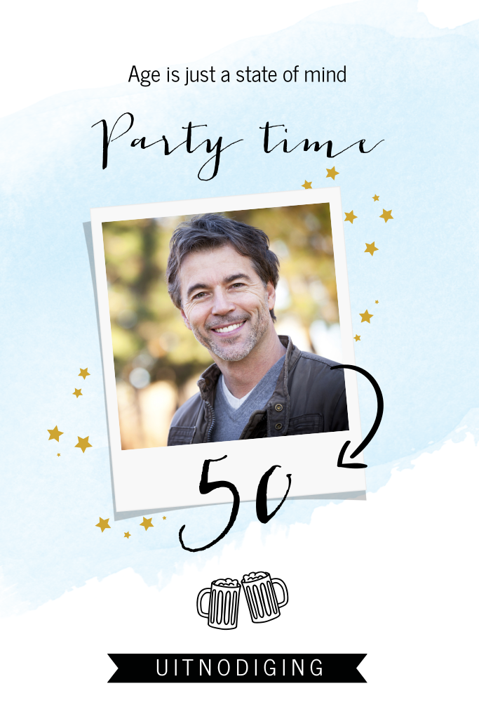 Watercolor verjaardagskaart met foto voor een 50-jarige. De proostende bierglazen maken de kaart extra feestelijk.