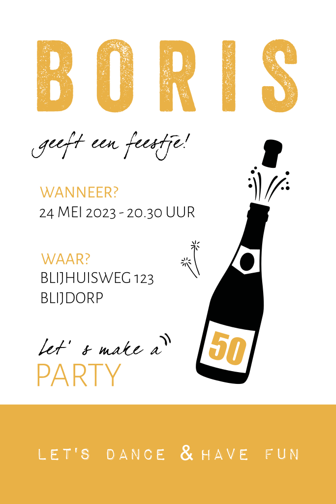 Typografische en hippe verjaardagsuitnodiging voor een 50-jarige. Op deze kaart is gebruikt gemaakt van handlettering. De champagne fles met knallende kurk maakt de kaart extra feestelijk. Deze kaart is door de geel met zwarte kleuren zowel te gebruiken voor een Abraham als Sarah.