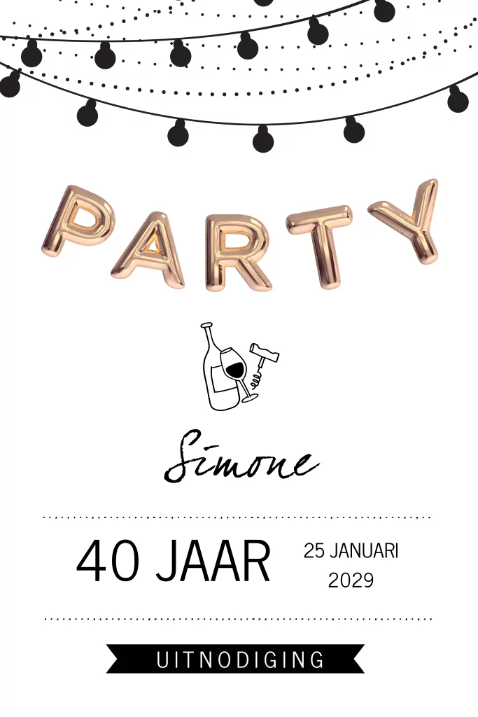 Hippe party verjaardagsuitnodiging voor een vrouw die 40 jaar wordt. Het woord 'party' en de leeftijd is in ballon foil en uiteraard aan te passen. Verder is de kaart gedecoreerd met een slinger en een fles wijn.