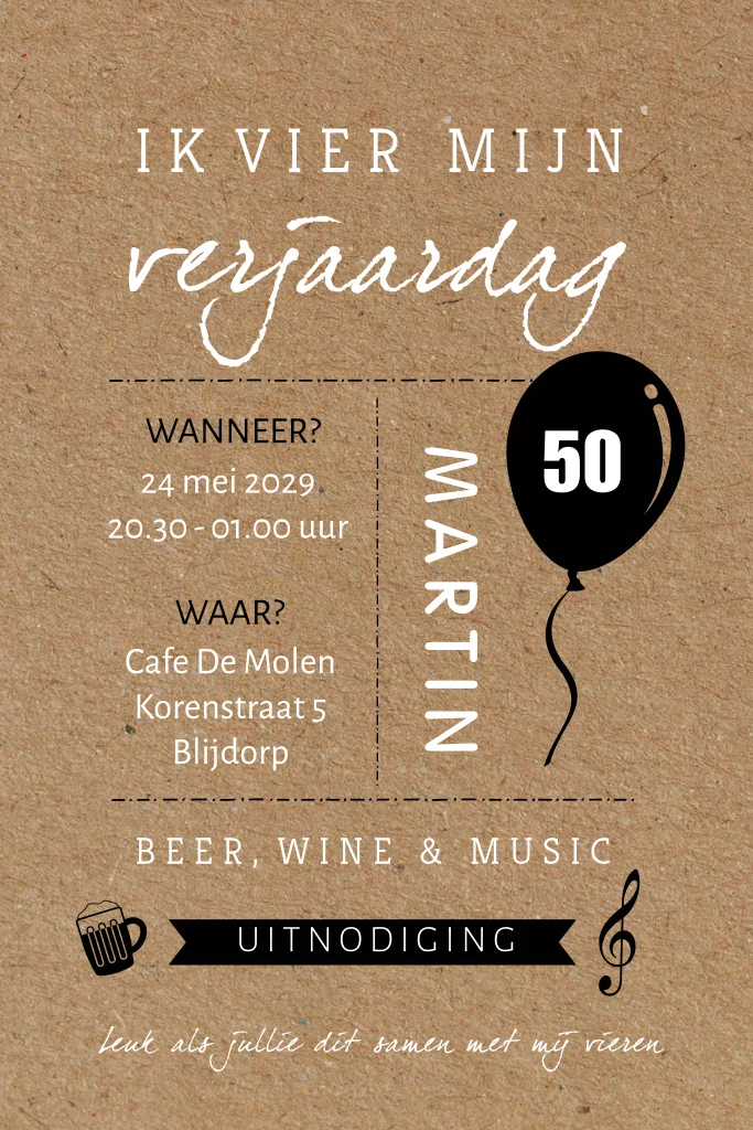 Uitnodigingskaartje voor een man van 50 jaar. Voor dit verjaardagskaartje is een karton achtergrond gebruikt. Verder is de kaart opgemaakt met verschillende lettertypes, een ballon, muzieknoot en bierglas.