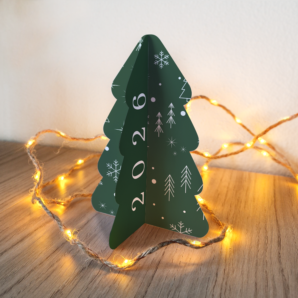 Een superleuke zakelijke 3D kerstkaart met het jaartal 2026! Bestel deze kerstkaart en zet hem zelf in elkaar. Schuif de bovenzijde van de ene kaart in de onderzijde van de andere kaart. Zo ontstaat er een 3D kerstboom. Pas deze kaart qua ontwerp naar eigen wens aan in onze online editor. Erg leuk en origineel om je ontvangers mee te verrassen.