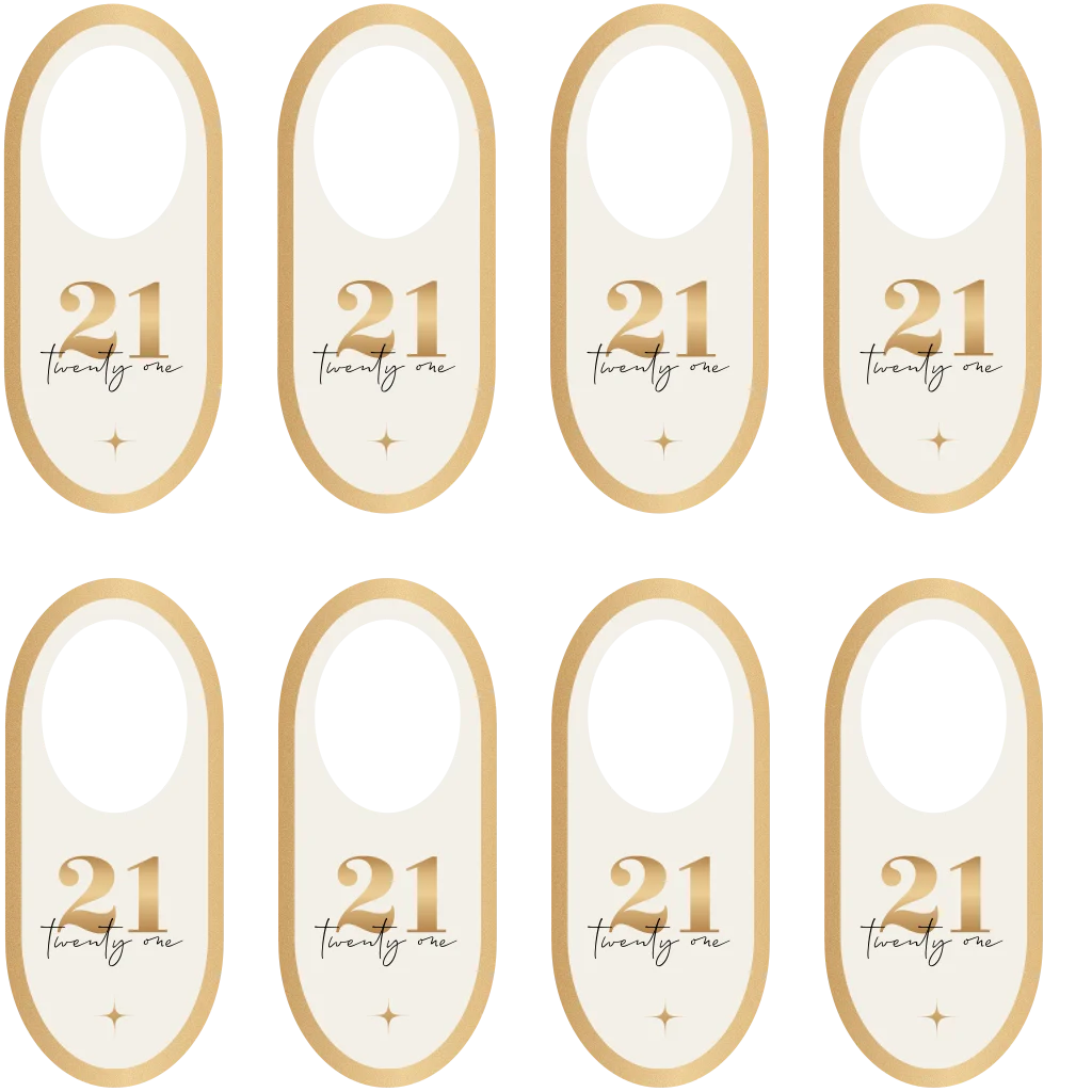 Met deze sprankelende flessenlabels steel jij de show met jouw 21 diner! Hang deze labels om de wijnflessen op tafel, in de stijl van jouw uitnodiging. Deze labels hebben een goudlook kader en een beige achtergrondkleur.| Totaalprijs: 0 |