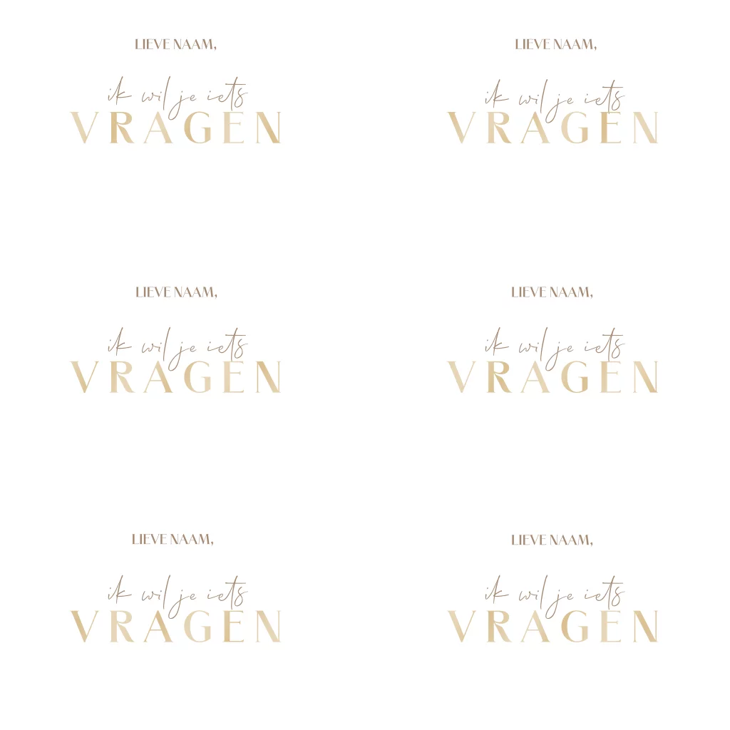 Vraag met deze kaart jouw getuige of ceremoniemeester op een originele manier om deze dierbare rol te vervullen op jullie bruiloft. Een mooie rustige set kaarten in neutrale tinten en in hoogglans vormgegeven. Pas de kaartjes naar eigen wens aan in onze online editor.