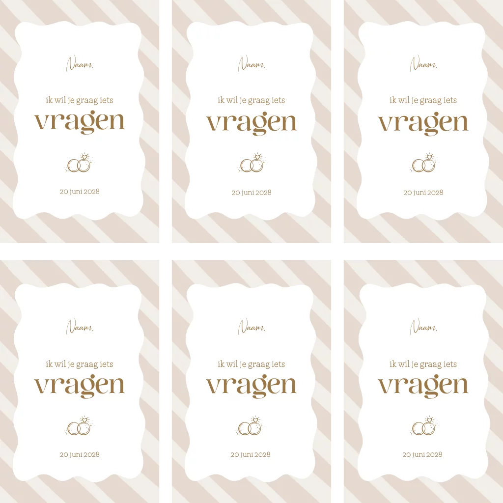 Een mooie gestreepte set kaarten in stijlvolle bruin en beige tinten. Op de voorkant van de kaart zie je een stel ringen binnen een golvend kader met dé belangrijke vraag voor jouw ceremoniemeester of getuige. Maak met deze set kaarten op een originele manier bekend dat jij jouw getuige of ceremoniemeester deze dierbare rol toevertrouwd.