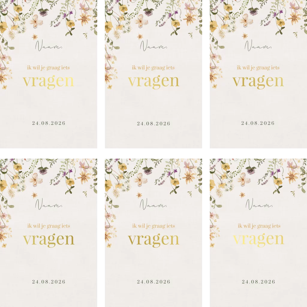 Een mooie beige set kaarten met kleurrijke, stijlvolle veldbloemen in een linnenlook. Op de voorkant van de labels staat de tekst 'Ik wil je iets vragen' in goudfolie vormgegeven voor een extra luxe uitstraling. Stel met deze labeltjes dé belangrijke vraag voor jouw ceremoniemeester of getuige en maak op een originele manier bekend dat jij jouw getuige of ceremoniemeester deze dierbare rol toevertrouwd. Pas de labeltjes naar eigen wens aan in onze online editor.