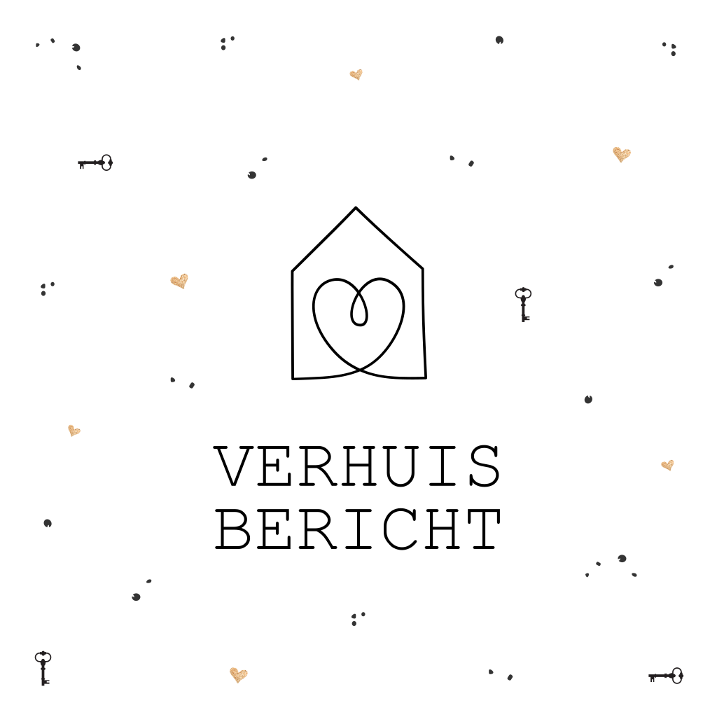 Basic verhuisbericht met op de voorzijde een strakke lijntekening van een huisje, omringd door kleine stipjes, hartjes en sleuteltjes. De teksten, kleuren en lettertypes van deze verhuiskaart zijn naar je eigen smaak aan te passen.