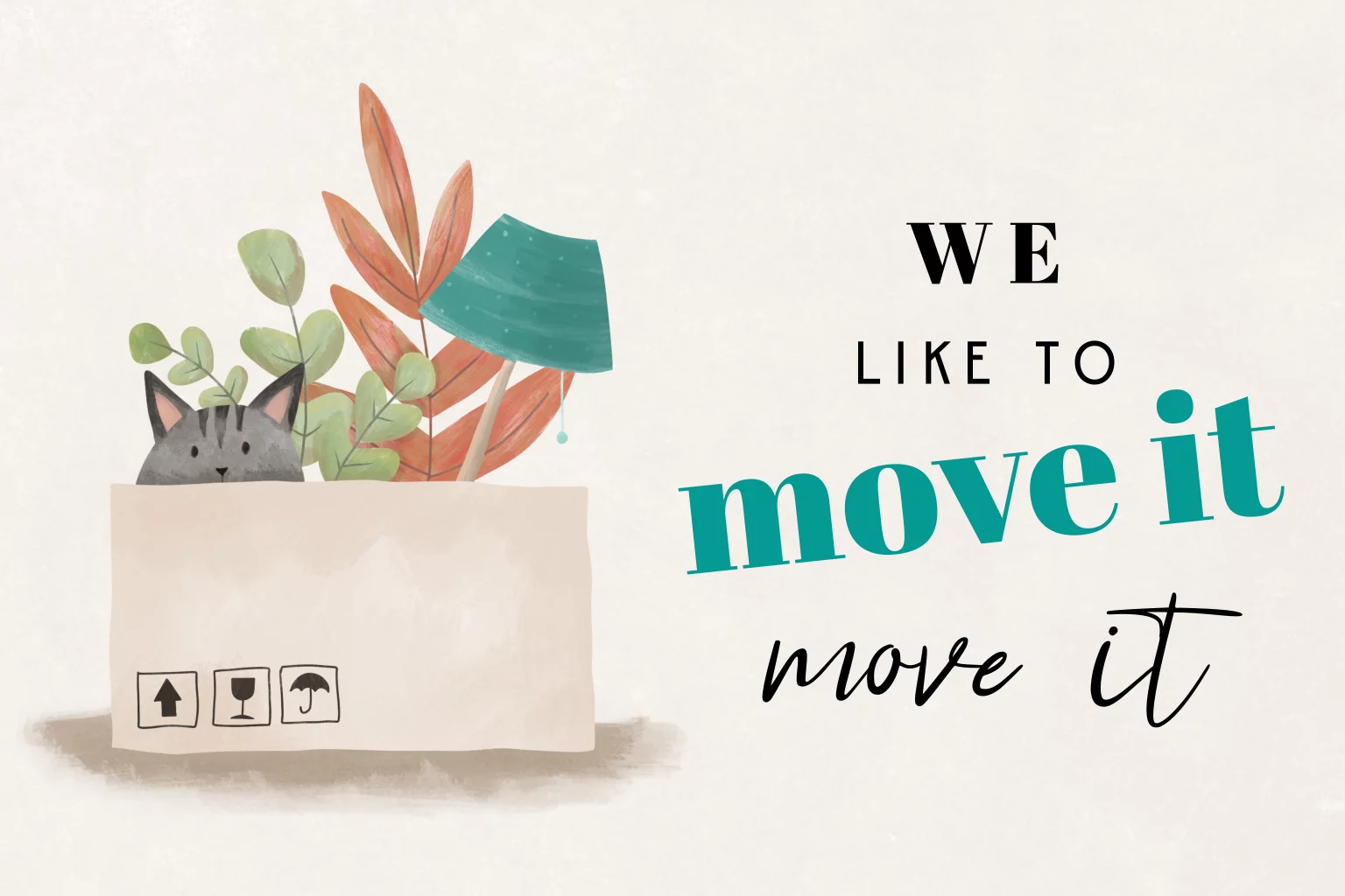 Verhuiskaart "We like to move it" met kat in verhuisdoos