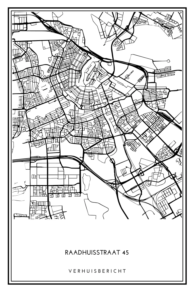 Hippe verhuiskaart om jullie vrienden en familie jullie nieuwe adres te laten weten. Nodig ze uit voor een borrel of housewarming met dit moderne verhuisbericht met echt foliedruk op zowel de voor- als achterzijde. Op deze kaart een witte achtergrond met daarop een zwarte plattegrond van Amsterdam. De tekst Amsterdam en de pin, op de plek waar jullie nieuwe huis staat, wordt gedrukt in echt goudfolie.