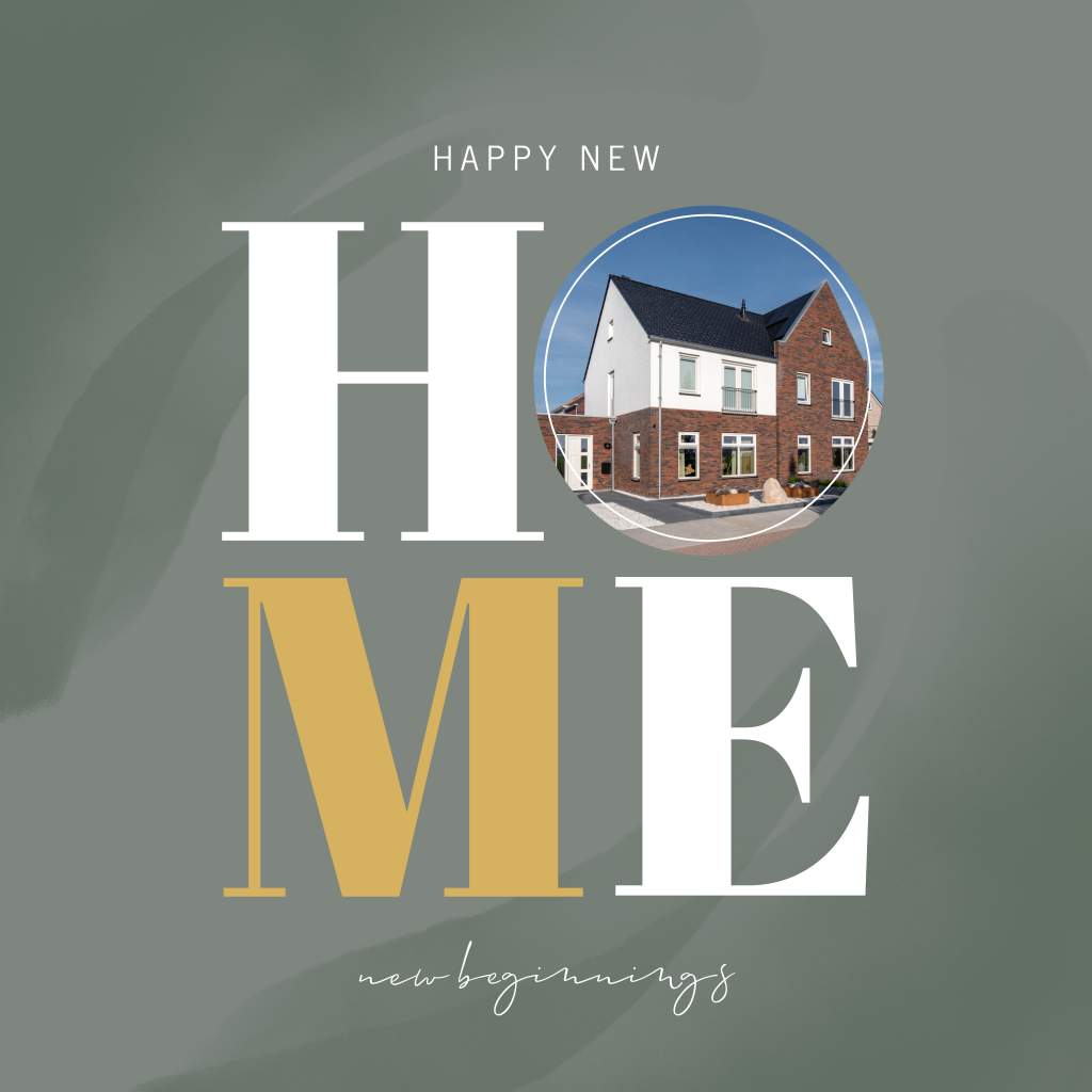 Gaan jullie verhuizen? Of samenwonen? Verstuur jullie nieuwe adres naar familie en vrienden met dit trendy verhuisbericht. Met in de letter -o- van -Home- een foto van jullie nieuwe stekje! Op de achtergrond een aquarel veeg. Voeg je persoonlijke tekst toe op de achterzijde, ook kun je hier een uitnodiging voor een housewarming toevoegen. Pas de kaart naar je eigen smaak aan in de editor.