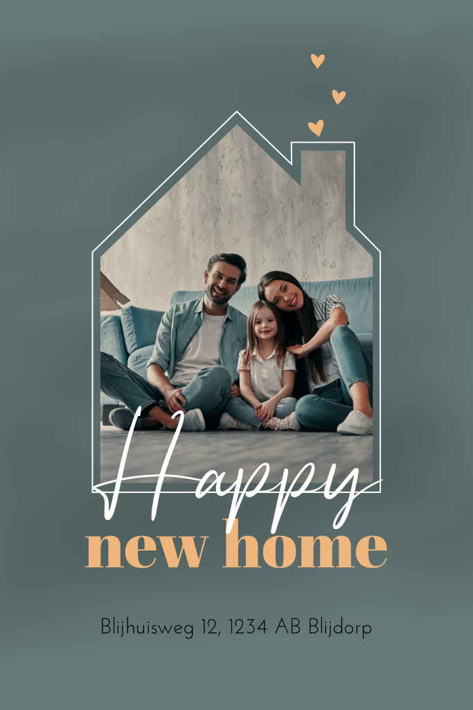 Een Happy New Home voor jullie! Want jullie gaan verhuizen. Stuur dan deze leuke verhuiskaart met foto en trendy blauwgrijze achtergrond kleur. Jullie foto plaats je in de vorm van een huis, met een subtiele, witte kaderrand er om. Uit de schoorsteen komen hartjes. Liefdevoller kan niet toch? Voeg je persoonlijke tekst toe op de achterzijde, ook kun je hier een uitnodiging voor een housewarming toevoegen. Pas de kaart naar je eigen smaak aan in de editor.