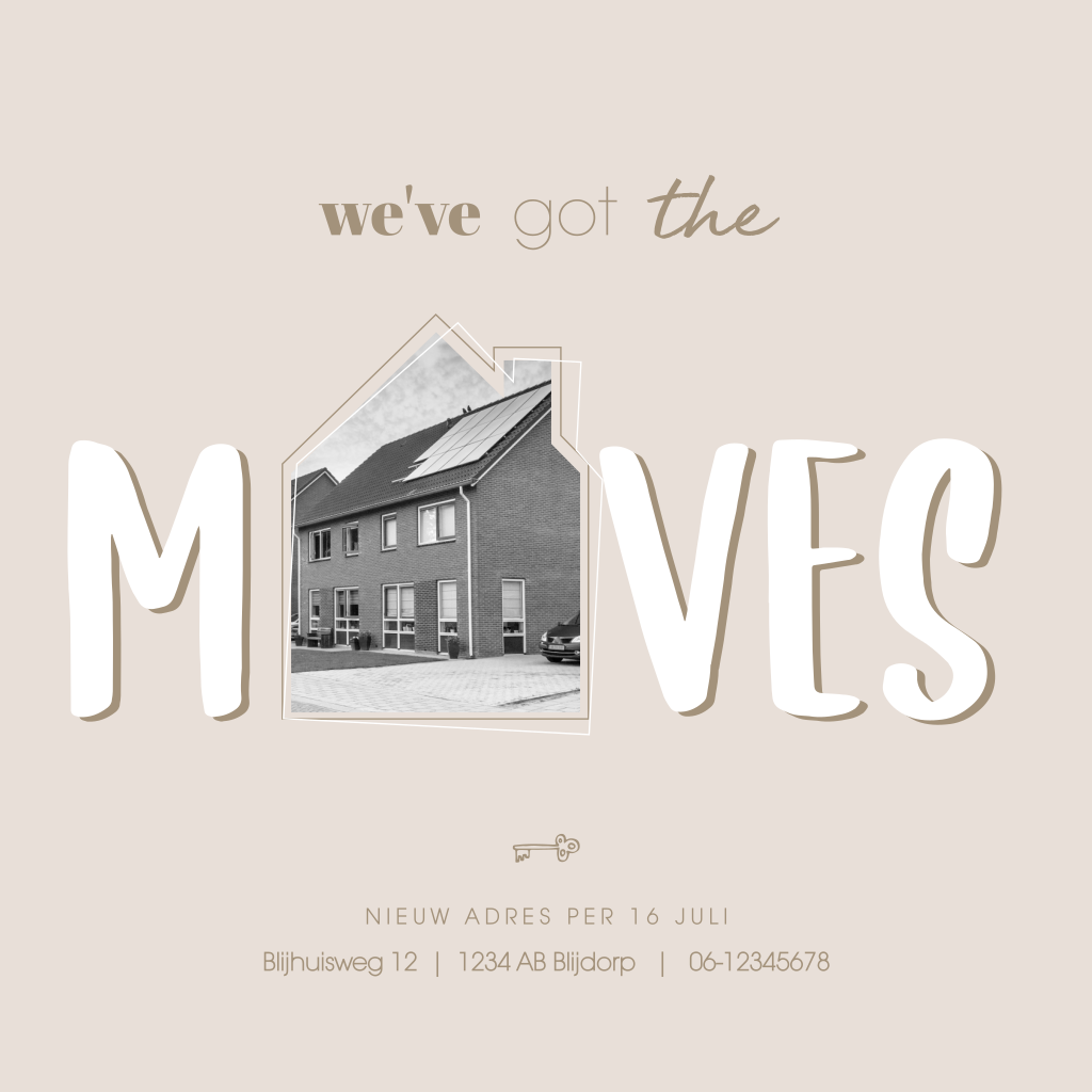 We've got the moves! Want jullie gaan verhuizen. Stuur deze leuke verhuiskaart met foto en trendy natuurlijke kleuren om jullie nieuwe adres bij familie en vrienden bekend te maken. Een foto van jullie nieuwe woning of van jullie zelf, plaats je in de vorm van een huisje, met leuke kader randjes eromheen. Voeg je persoonlijke tekst toe op de achterzijde. Pas de kaart naar je eigen smaak aan in de editor. Hulp nodig? We helpen je graag!