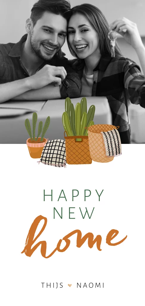 Happy New Home verhuiskaart met foto en illustraties van kamerplanten met mooie manden en kleedjes. Voeg een leuke persoonlijke foto toe. Pas de teksten en kleuren naar je eigen smaak aan in de editor en combineer met een mooie envelop om het helemaal af te maken.