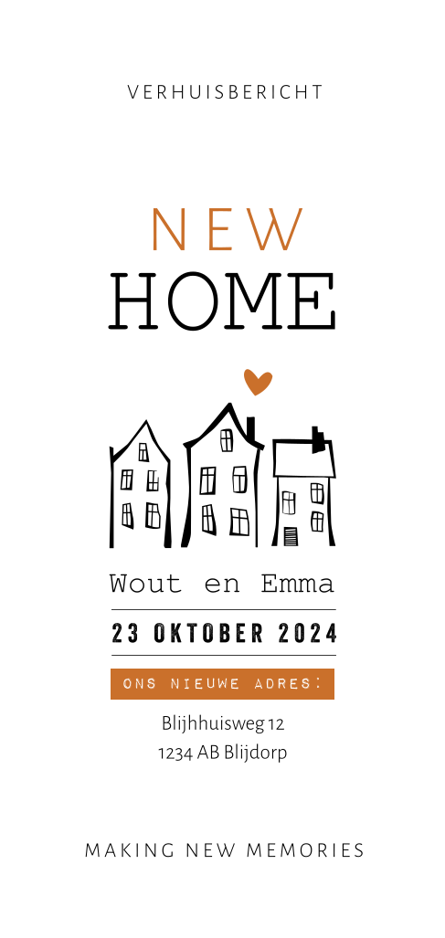 Hip verhuisberichtje New home met een getekend huisje en verschillende lettertypes in trendy kleuren.