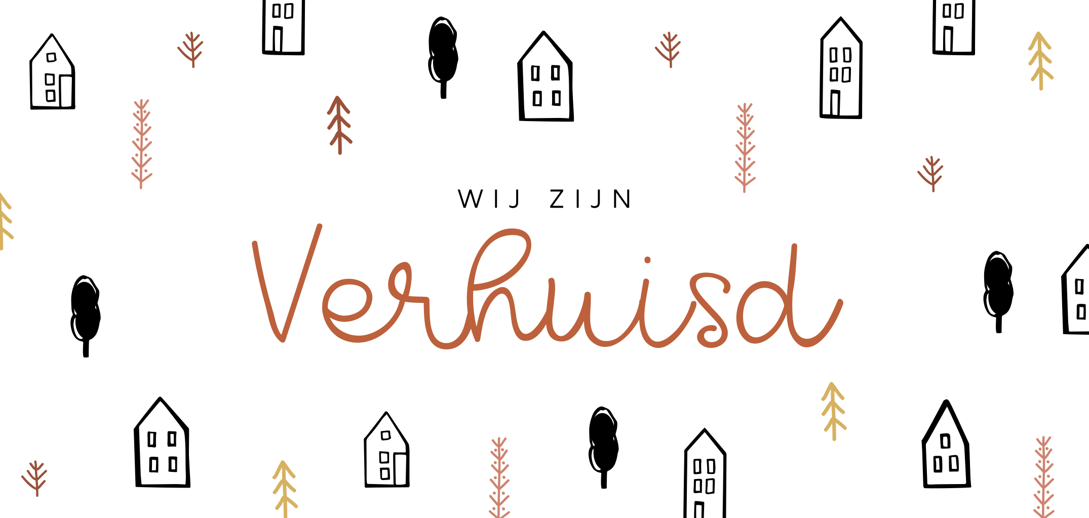 Vrolijke verhuiskaart met sierlijke letters. Op de voorkant van dit verhuisbericht staat een patroon van vrolijke huisjes en bomen. Huisje meer of minder? Pas het eenvoudig aan in onze editor.