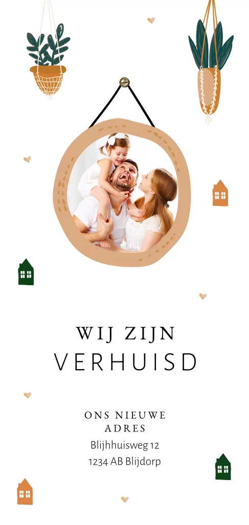 Hippe verhuiskaart met foto waarbij gebruik is gemaakt van vrolijke en trendy kleuren. Op het kaartje staat een foto met daar omheen hangplanten, kleine huisjes en hartjes.