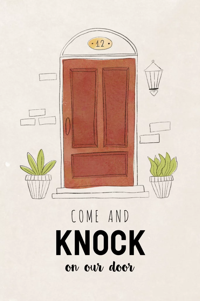 "Come and knock on our door" verhuiskaart met illustratie van voordeur