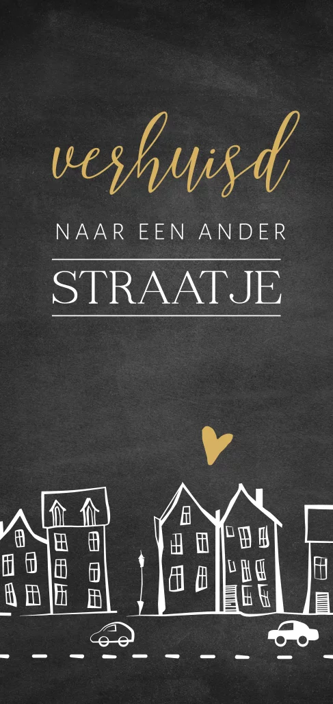 Verhuiskaart met de tekst "verhuisd naar een ander straatje" Deze kaart heeft een krijtbord achtergrond, een mooie combinatie met wit en goudkleur. Op deze verhuiskaart staan huisjes, een straat met auto's en een hartje. Pas de teksten en kleuren naar wens aan in de editor.