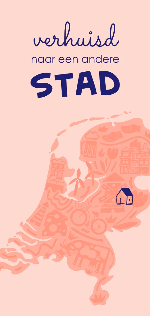 Verhuiskaart met de tekst "verhuisd naar een andere stad" en een landkaart van Nederland. Verplaats het huisje op de landkaart naar de plek van jullie nieuwe woonplaats. Op de achterkant van dit kaartje kun je jullie nieuwe adres vermelden en een eventuele uitnodiging voor een borrel of housewarming. Kleuren en teksten zijn aan te passen in de editor.