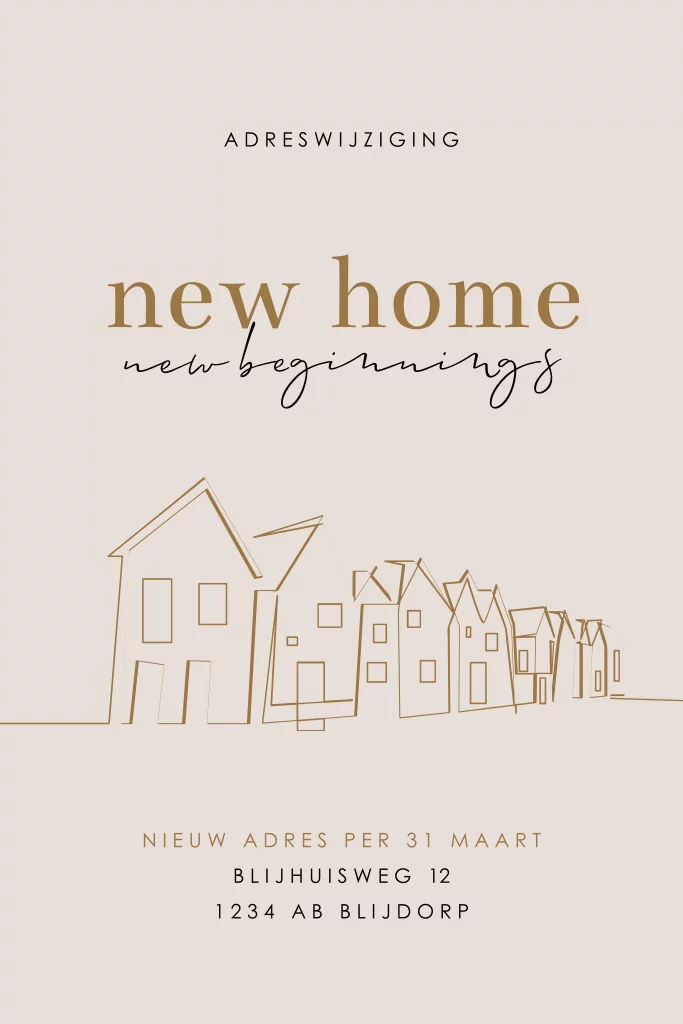 Verhuisbericht in natuurlijke kleuren, waarmee je iedereen kunt laten weten waar jullie New Home staat. Op dit verhuiskaartje een abstracte lijntekening van rijtjeshuizen. Kleuren en teksten pas je eenvoudig aan in onze editor.