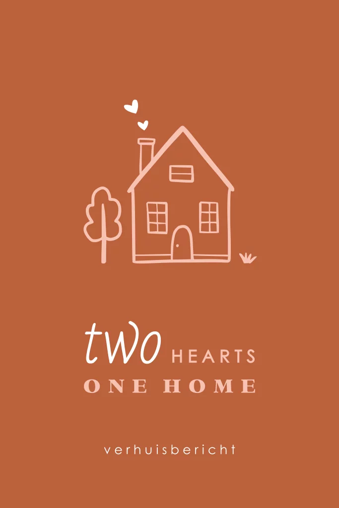 Romantisch "two hearts, one home" verhuisbericht met op de voorzijde een lijntekening van een huisje, met kleine hartjes erboven. Deze verhuiskaart heeft afgeronde hoeken en een trendy oudroze aquarel achtergrond. De teksten, kleuren en lettertypes van deze verhuiskaart zijn naar je eigen smaak aan te passen. Op de achterkant kun je een uitnodiging voor een housewarming toevoegen.