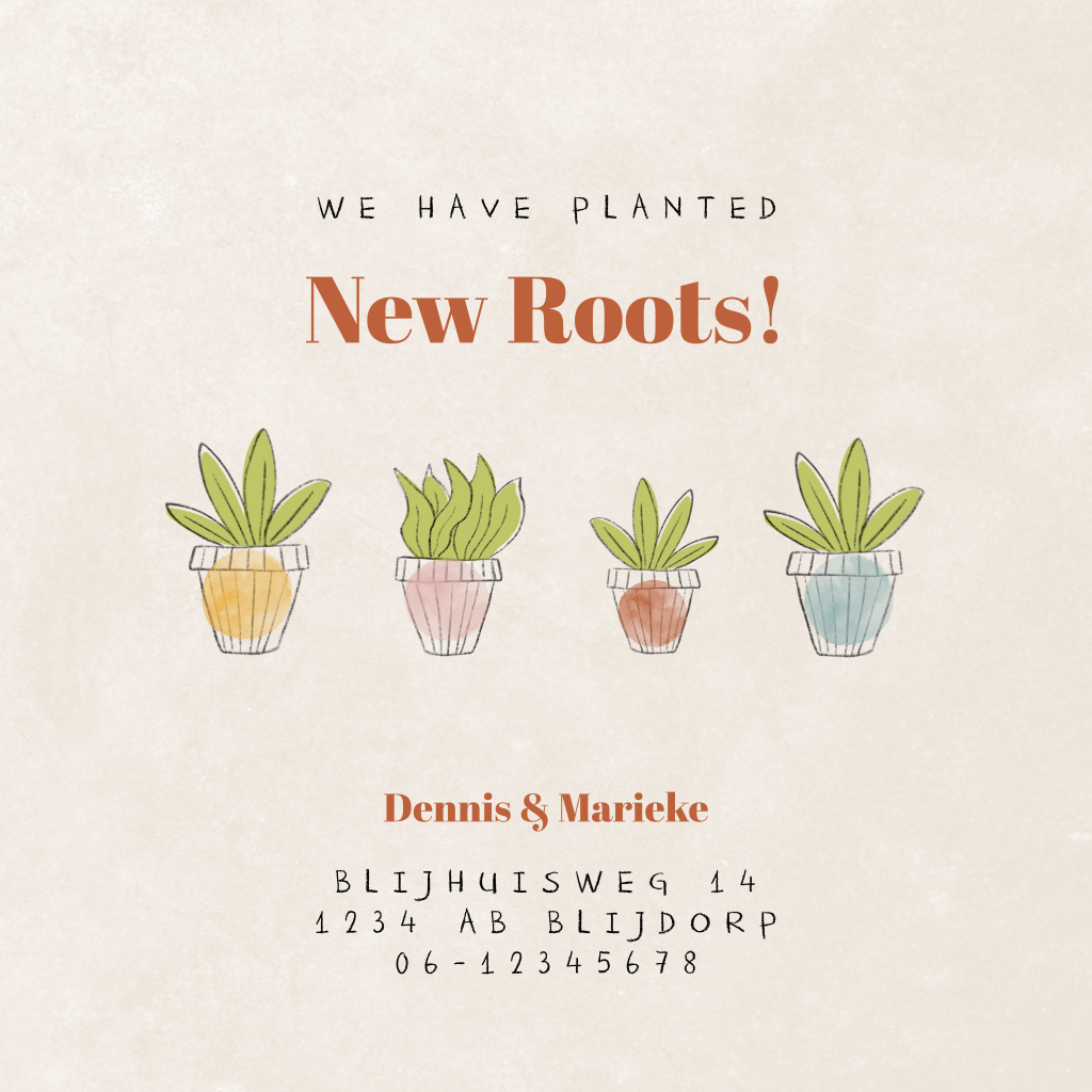 New Roots verhuiskaart met ronde hoeken en aquarel kamerplanten