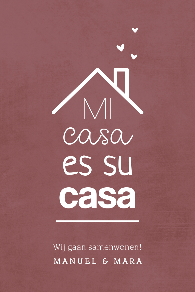 Mi casa es su casa! Deze tekst staat op dit schitterende verhuisbericht onder het dakje van jullie huis, waar de hartjes uit de schoorsteen komen. Want jullie gaan samenwonen! Verstuur jullie nieuwe adres naar familie en vrienden met deze mooie verhuiskaart. De kaart is voorzien van luxe roséfolie. Voeg je persoonlijke tekst toe op de achterzijde, ook kun je hier een uitnodiging voor een housewarming op toevoegen. Pas de (folie)kleuren en teksten van de kaart naar je eigen smaak aan in onze ontwerpmodule.