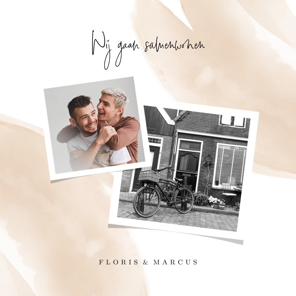 Jullie gaan samenwonen! Op deze hippe verhuiskaart een fotocollage waarmee je iedereen kan laten zien welk huis jullie thuis gaat worden. Op de achtergrond aquarel vegen in een trendy aardetint. Teksten, kleuren en lettertypes pas je eenvoudig aan in onze editor.