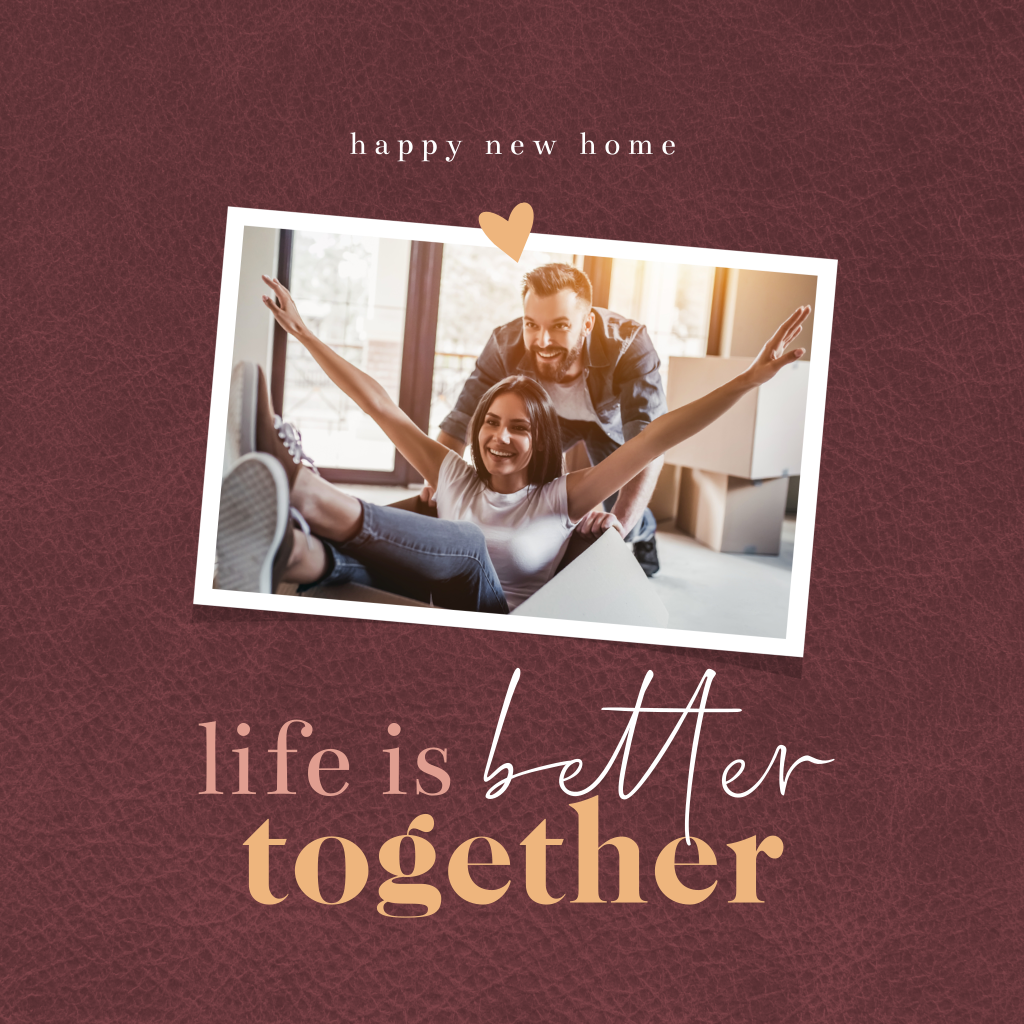 Life is better together! Gaan jullie verhuizen? Of samenwonen? Stuur dan deze hippe kaart met foto en trendy kleuren. Voeg je persoonlijke tekst toe op de achterzijde, ook kun je hier een uitnodiging voor een housewarming toevoegen. Pas de kaart naar je eigen smaak aan in de editor.