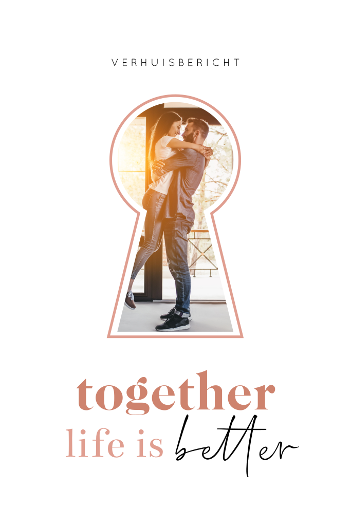 Together life is better! En zo is het! Dus jullie gaan verhuizen of samenwonen. Verstuur jullie nieuwe adres naar familie en vrienden met dit hippe verhuisbericht. Op deze verhuiskaart een foto in een sleutelgat, toepasselijk toch? Plaats jullie eigen schitterende foto in de kaart. Voeg je persoonlijke tekst toe op de achterzijde. Ook kun je hier de datum van jullie housewarming toevoegen. Kleuren en teksten zijn eenvoudig aan te passen. Hulp nodig? We helpen je graag!