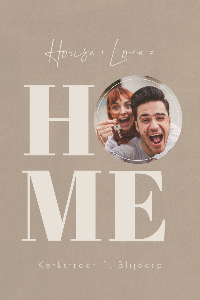 Op deze kaart staat de tekst House + Love = Home en kun je een eigen foto toevoegen.