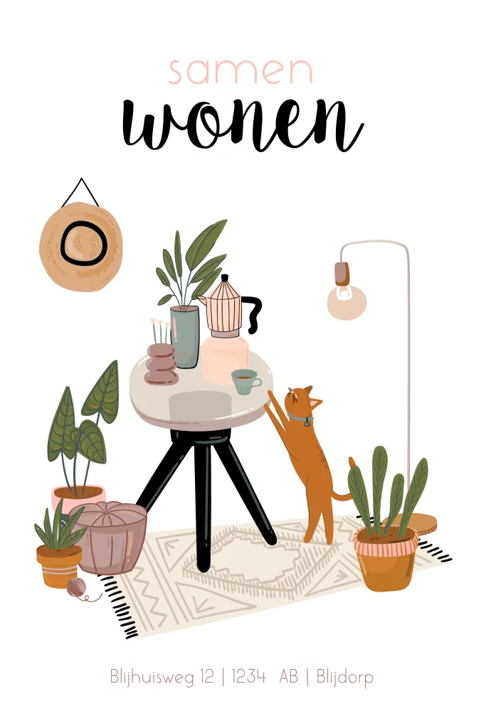 Verhuiskaart om te laten weten dat jullie gaan samenwonen. Op dit verhuisbericht zie je een illustratie van een interieur, een gezellig kleedje met tafel met planten, koffie en een kat. Klik op bewerken en ga met deze verhuiskaart aan de slag in de editor!