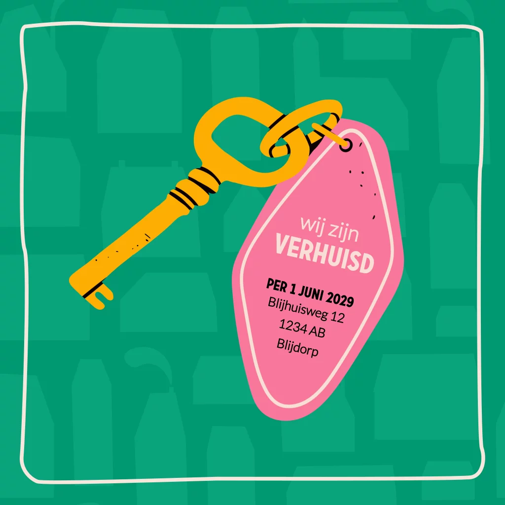 Hippe en kleurrijke verhuiskaart met een patroon van huisjes en kader met sleutel met sleutelhanger. Pas de kaart naar je eigen smaak aan in de editor.