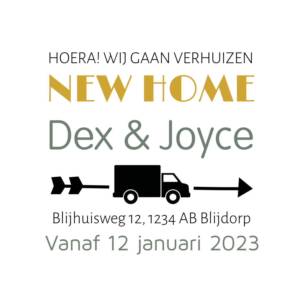 Trendy verhuiskaart met op de voorzijde tekst, een pijl en een verhuiswagen. Er zijn verschillende lettertypes gebruikt om de verhuisdatum en het nieuwe adres kenbaar te maken. De kleuren en teksten op de kaart zijn gemakkelijk aan te passen.