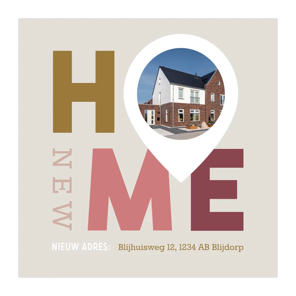 Typografische verhuiskaart met een pin van jullie nieuwe woon locatie. Zet in de pin een foto van jullie nieuwe huis. De kaart heeft een neutrale beige achtergrond met witte rand en kleurrijke teksten. Laat met deze verhuiskaart iedereen weten dat jullie en new home hebben!