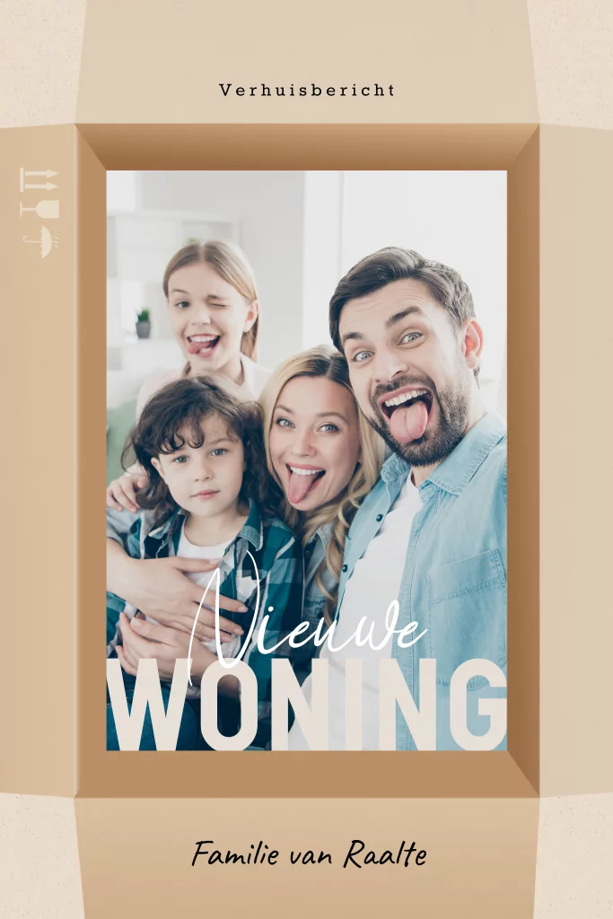 Hebben jullie een nieuwe woning? Laat dit iedereen weten met deze unieke verhuiskaart in de vorm van een verhuisdoos in kartonlook. Zet in het fotokader een eigen foto.