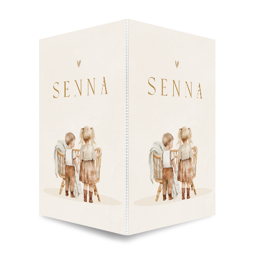 Een mooi staand en dubbel geboorte raambord met een aquarel tekening van een broer en zus bij de wieg van hun kleine broertje of zusje. De zachte, aardse tinten van beige en bruin geven dit raambord een rustige uitstraling. Het bord is ook mogelijk in een andere gezinssamenstelling.
