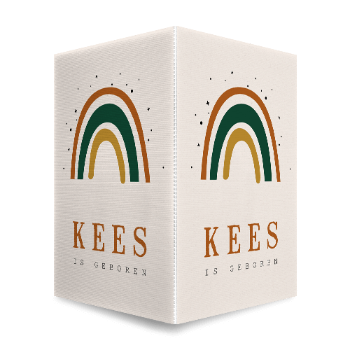 Basic geboorte raambord voor een jongen, met een trendy regenboog. De babynaam Kees komt op deze manier mooi naar voren en de teksten zijn in onze editor eenvoudig aan te passen. Het staande en dubbele raambord is makkelijk aan de buitenkant van het raam te bevestigen.