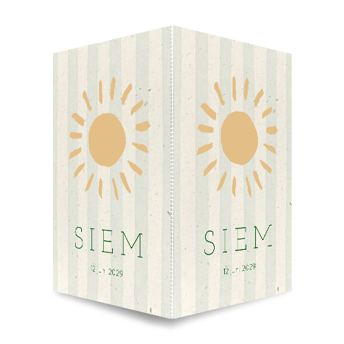 Een vrolijk raambord voor een jongen met een gestreepte achtergrond en zon. De babynaam Siem komt op deze manier mooi naar voren. Teksten zijn in onze editor eenvoudig aan te passen. Het staande en dubbele raambord is makkelijk aan de buitenkant van het raam te bevestigen.