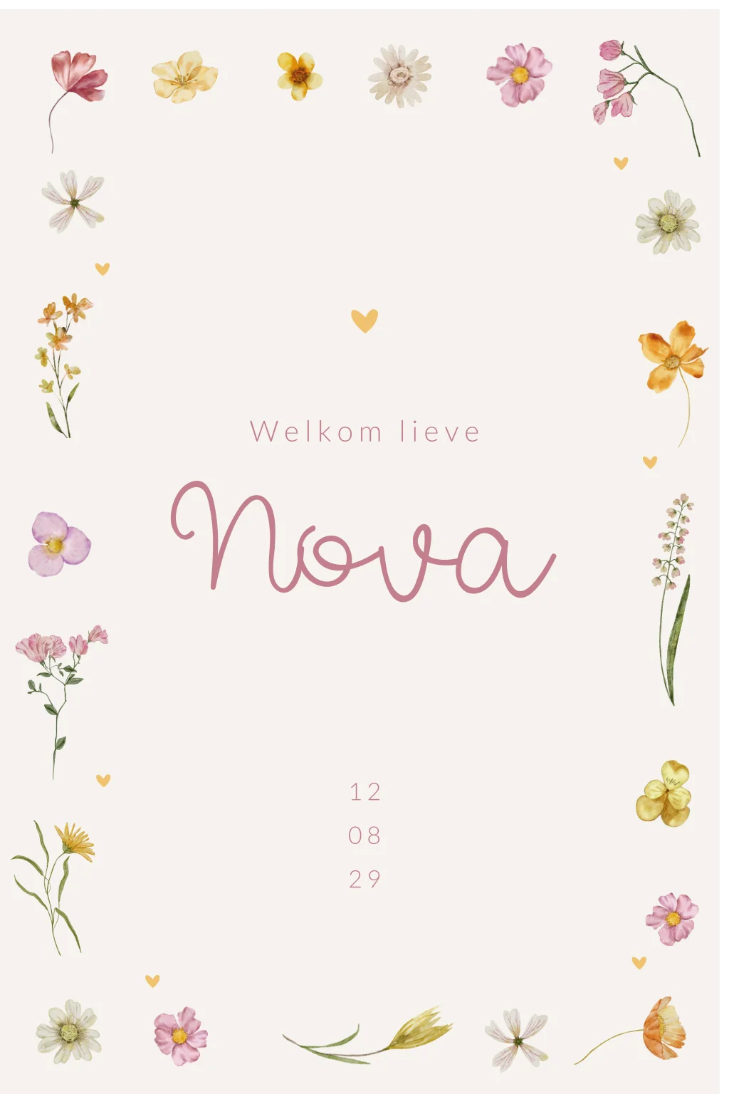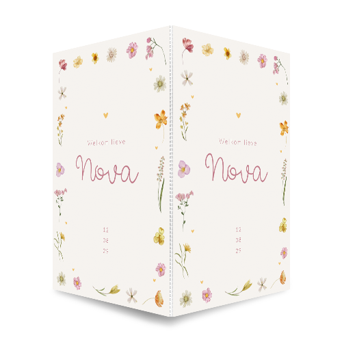 Staand dubbel raambord voor de geboorte van jullie kleine meisje. Op dit raambord Nova zie je een mooi omrand kader van vrolijke bloemen met hartjes. Een echt vrolijk en lieflijk raambord voor een dochter.