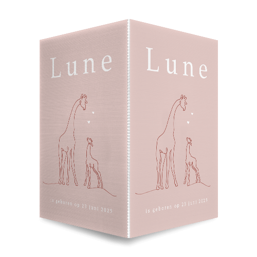 Basic geboorte raambord voor een meisje met de babynaam Lune. Dit geboortebord heeft een oudroze achtergrondkleur met daarop een afbeelding van giraffen in one line. Plaats het bord aan de buitenkant van het raam en laat iedereen weten dat jullie meisje is geboren. Teksten zijn eenvoudig aan te passen in onze editor.