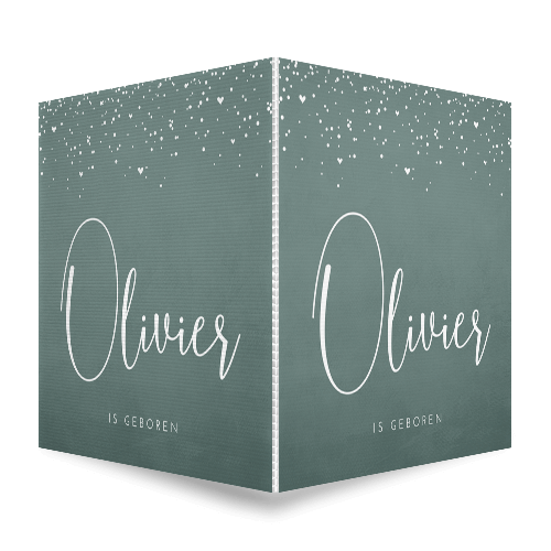 Basic geboorte raambord voor een zoon met de babynaam Olivier. Dit geboortebord heeft een trendy grijze achtergrondkleur met een ruwe structuur en een stipjes en hartjes patroon aan de bovenkant. Laat de hele buurt weten dat jullie kindje is geboren en bevestig het geboortebord aan de buitenkant van het raam. Teksten zijn eenvoudig aan te passen in onze editor.
