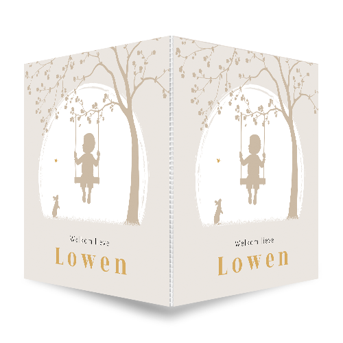 Een vierkant en dubbel geboortebord voor een jongen. Op dit raambord Lowen zie je een silhouet van een jongetje op een schommel aan een boom. Er kijkt een lief konijntje naar het jongetje. Het geboorte raambord is eenvoudig op het raam te bevestigen en is weerbestendig. De babynaam en teksten zijn in onze editor makkelijk aan te passen.| Totaalprijs: 0 |