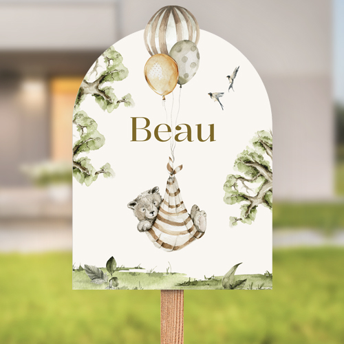 Unisex geboortebord Beau voor een jongen of meisje in een mooie boogvorm. Dit tuinbord voor de geboorte van een jongen of meisje is leuk om als familie, buren, vrienden of natuurlijk zelf in de tuin te zetten. Versier hiermee de tuin en vier dat er een baby is geboren. Op dit originele geboorte tuinbord zie je een een beertje in een doek aan een tros ballonnen hangen. Rondom de ballonnen zie je twee vogeltjes en een aantal takken van een boom. Boven de naam Beau zie je een klein hartje.
