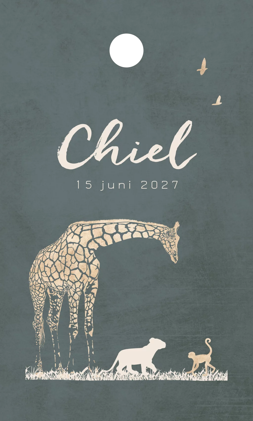 Geboortelabeltjes voor aan bijvoorbeeld een geboortebedankje of doopsuiker voor een jongen. Op deze labeltjes Chiel staan safaridieren zoals giraf, welpje en een aapje. De achtergrond heeft een aquarel look en is donkergroen.