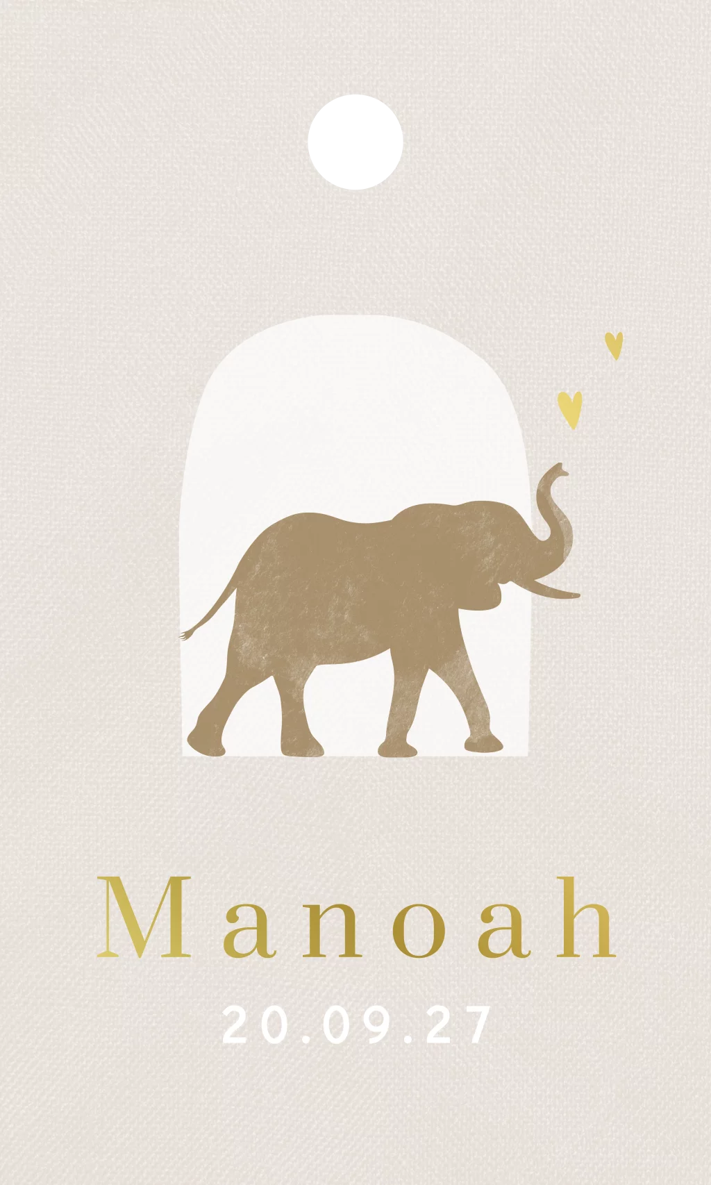 Geboortelabeltje voor aan bijvoorbeeld een geboortebedankje of doopsuiker voor een jongetje of meisje. Op deze labeltjes Manoah staat een silhouetje van een olifant. Op de achtergrond staat een organische boogvorm met hartjes. Het labeltje heeft een beige achtergrond kleur en de naam van jullie zoon of dochter en hartjes worden gedrukt in gouden foliedruk.
