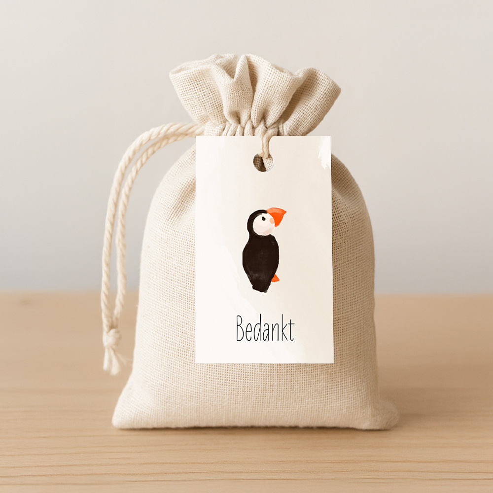 Geboortelabeltjes voor aan bijvoorbeeld een geboortebedankje of doopsuiker voor een jongen of meisje. Op dit labeltje staat een illustratie van een schattige papegaaiduiker en de tekst 'bedankt'.| Totaalprijs: 0 |