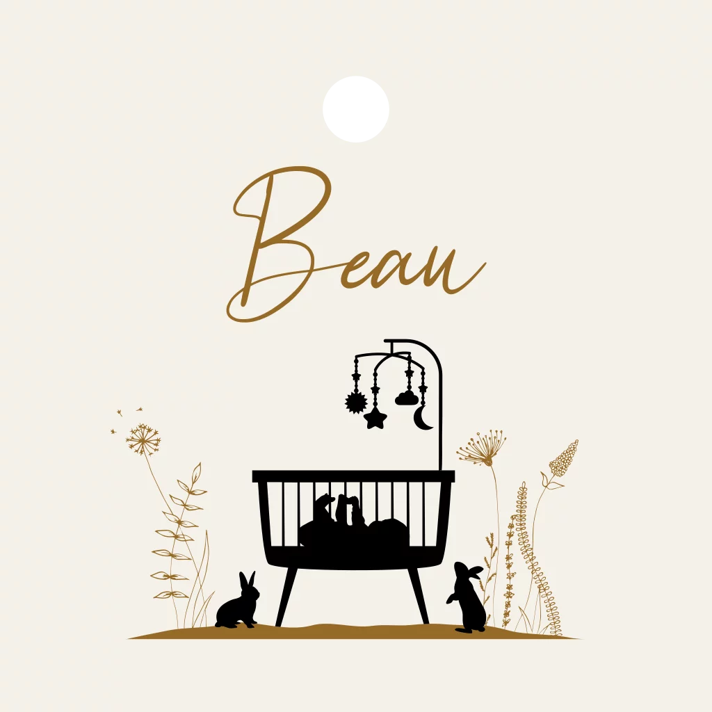 Vier de geboorte van jullie zoon of dochter met deze complete set vierkante nude labelkaartjes met silhouet van een wiegje met baby en konijntjes. Ideaal om te gebruiken voor aan een traktatie, doopsuiker of bedankje.