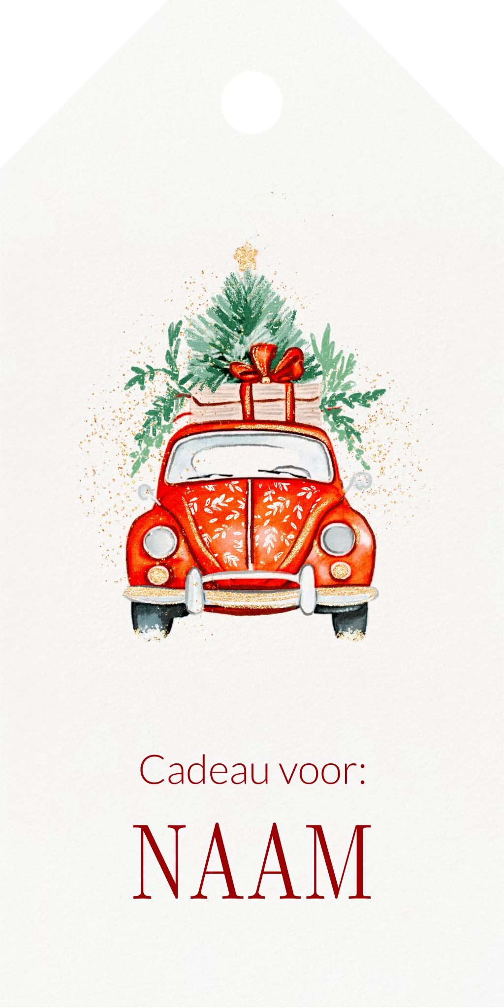 Een leuk kerst labeltje met een kerst tafereel! Op dit labeltje zie je een auto met de kerstboom op het dak. Om de auto heen zie je allerlei gouden stipjes. Pas dit labeltje naar eigen wens aan in de online editor voor de persoonlijke touch.