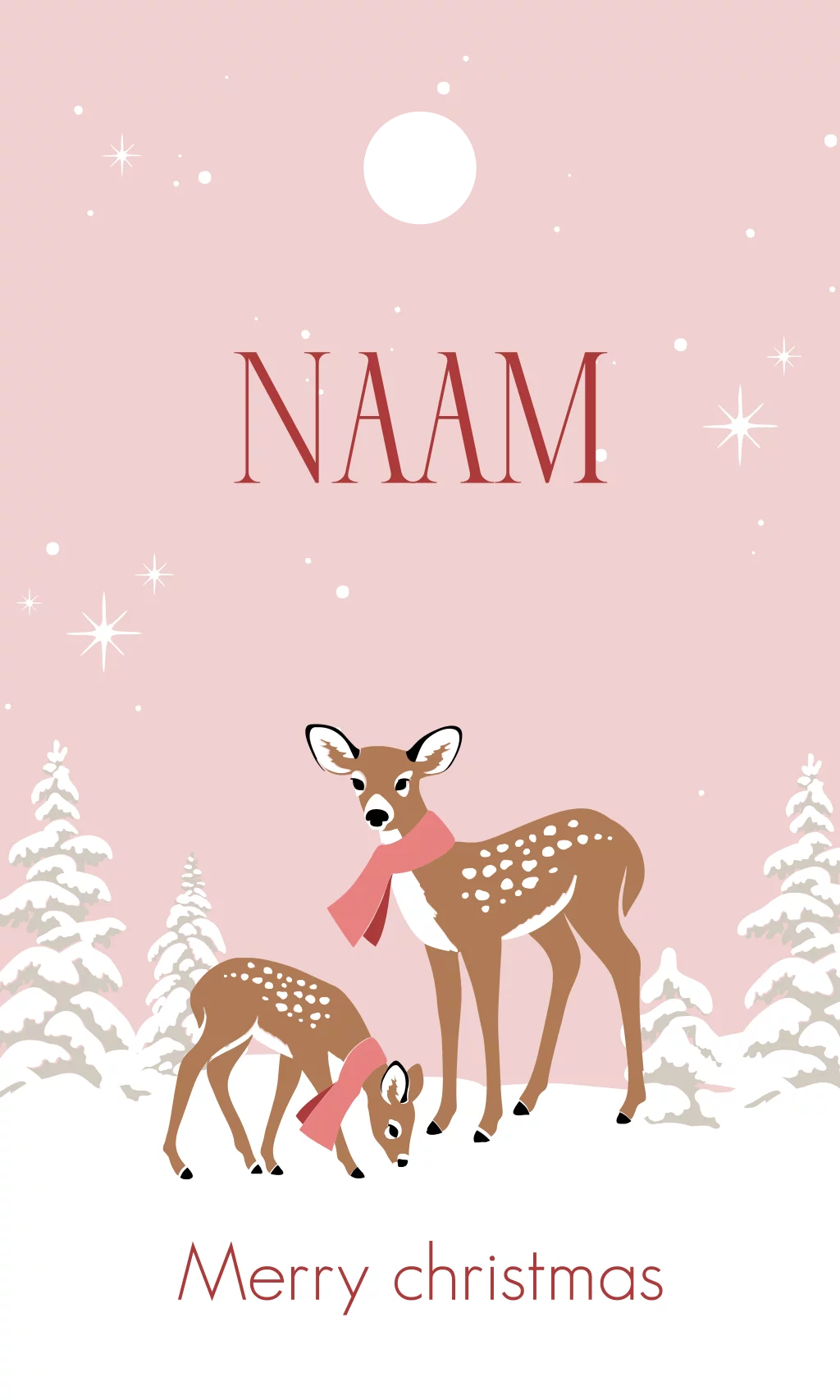 Een schattig kerst labeltje met een roze achtergrond en opvallende sterretjes. Op dit labeltje zie je twee rendieren met een sjaal om in een besneeuwd winterlandschap. Wens de ontvanger een vrolijk kerstfeest en een voorspoedig nieuwjaar met dit prachtige labeltje.